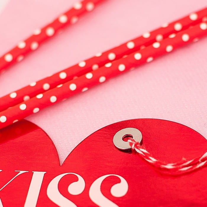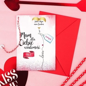 - Zdrapka jest wykonana w formacie tradycyjnej karty. W rogu posiada niewielki otwór, przez który przeprowadzony jest sznurek z zawieszką. To ona służy do zdrapywania złotej zdrapki w kształcie serca. U góry i u dołu karta ozdobiona jest różowym brokatem. W górnej części znajduje się złote serce ze sznurkiem, który tworzy napis love i sięga aż do końca kartki. Do niego dołączona jest etykietka Walentynki. Na środku po lewej stronie widnieje napis: Mam dla Ciebie wiadomość. Poniżej znajduje się różowa szarfa, a w niej data – 14.02. Zdrapka Mam Wiadomość znajdzie się w czerwonej kopercie.