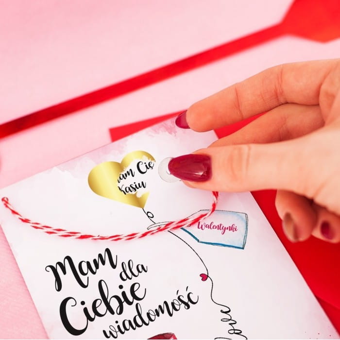 - Jeśli szukasz tradycyjnego prezentu na Walentynki, ale w oryginalnej formie, to zamiast zwykłej kartki wybierz zdrapkę. Od razu po jej otrzymaniu kobieta zabierze się za zdrapywanie serduszka. Całe szczęście dzięki temu, że dołączone jest metalowe kółeczko nie zniszczy swojego manicure. W tym miejscu możesz umieścić dowolny tekst. Najprostszym pomysłem jest oczywiście wyznanie miłości. Oczywiście możesz to pole wykorzystać również na ważne pytanie, nawet oświadczyny. W taki sposób możesz również zaproponować wspólne zamieszkanie. Może się tu znaleźć także prosty walentynkowy przekaz, np. „Dziś wieczorem zabieram Cię na kolację”.