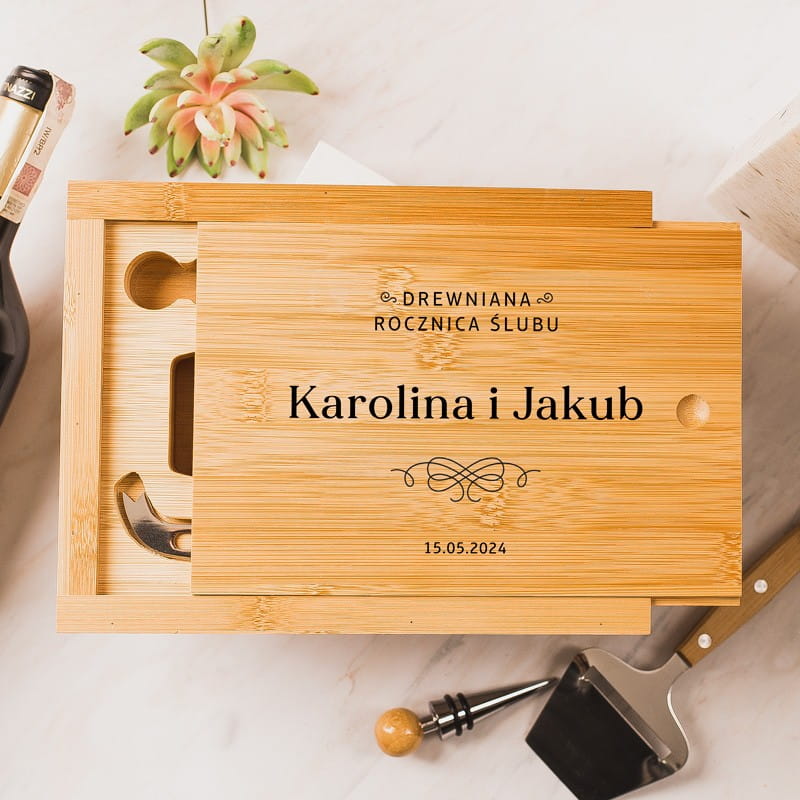 Bambusowy zestaw do sera i wina z personalizowanym wieczkiem to stylowy i praktyczny prezent na drewnianą rocznicę ślubu. Zawiera korkociąg, zatyczkę do butelki, łopatkę oraz nóż do sera – wszystko zamknięte w eleganckim pudełku z imionami i datą. Idealny upominek dla pary, która ceni wspólne chwile przy winie i przekąskach.