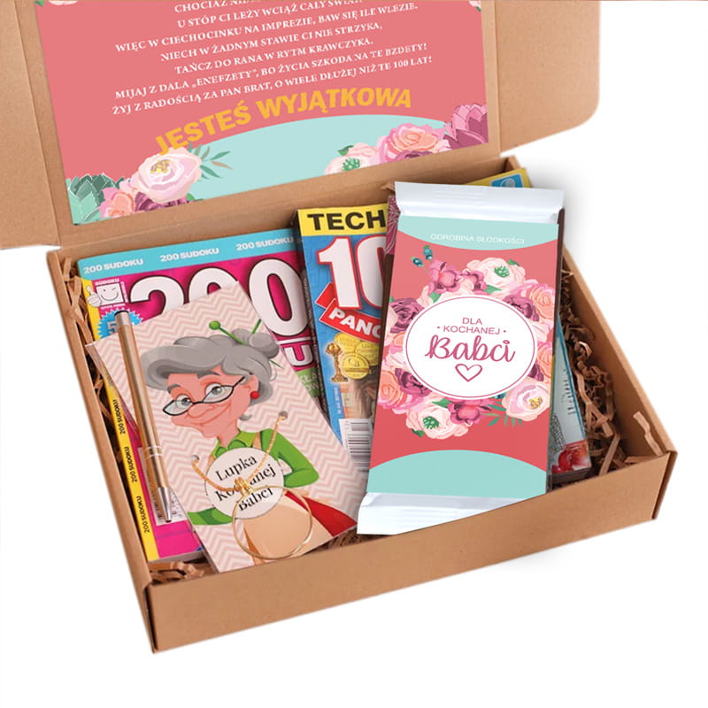 Jeśli chcesz podarować babci prezent, który realnie umili jej wolny czas, ten box będzie idealnym wyborem. To zestaw stworzony z myślą o relaksie, dobrej zabawie i przyjemnych drobiazgach, które poprawiają humor. Krzyżówki, praktyczne akcesoria i słodki dodatek tworzą komplet, który sprawdzi się jako gotowy upominek – taki, który daje radość od razu po otwarciu pudełka.