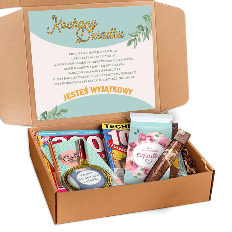 Szukasz pomysłu na prezent, który od razu wywoła uśmiech? Ten box to świetny prezent dla dziadka – gotowy do wręczenia, elegancko zapakowany i wypełniony drobiazgami, które umilają czas: łamigłówki, słodkości i praktyczne dodatki.