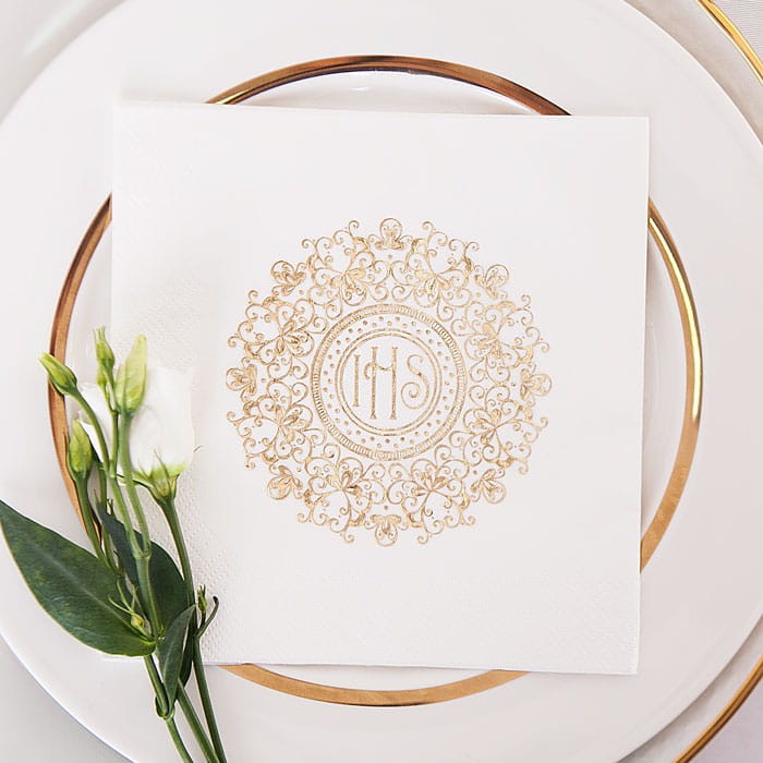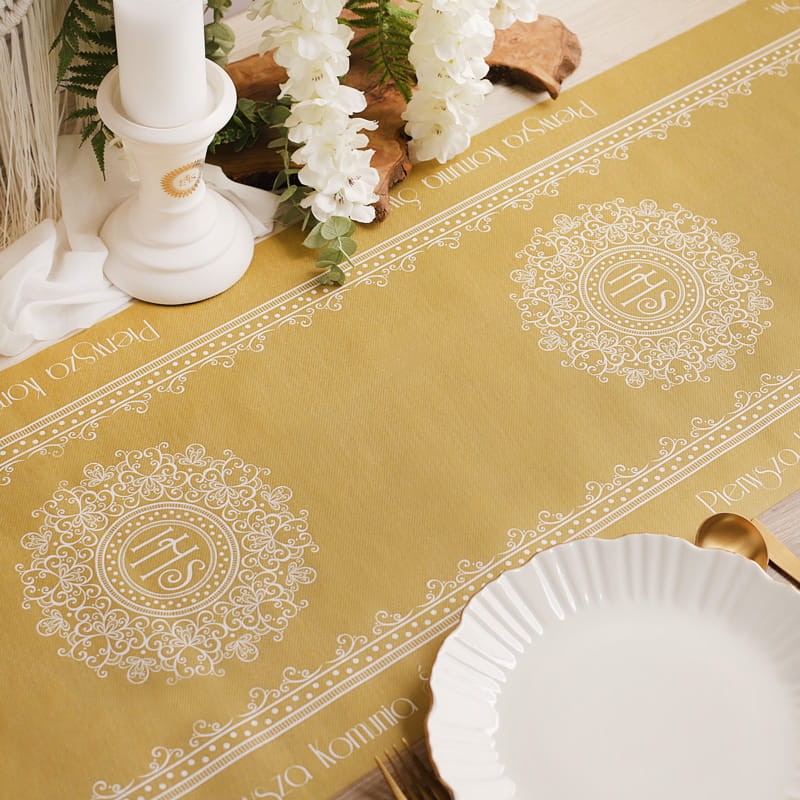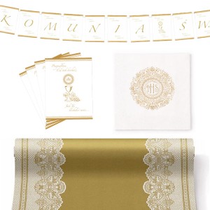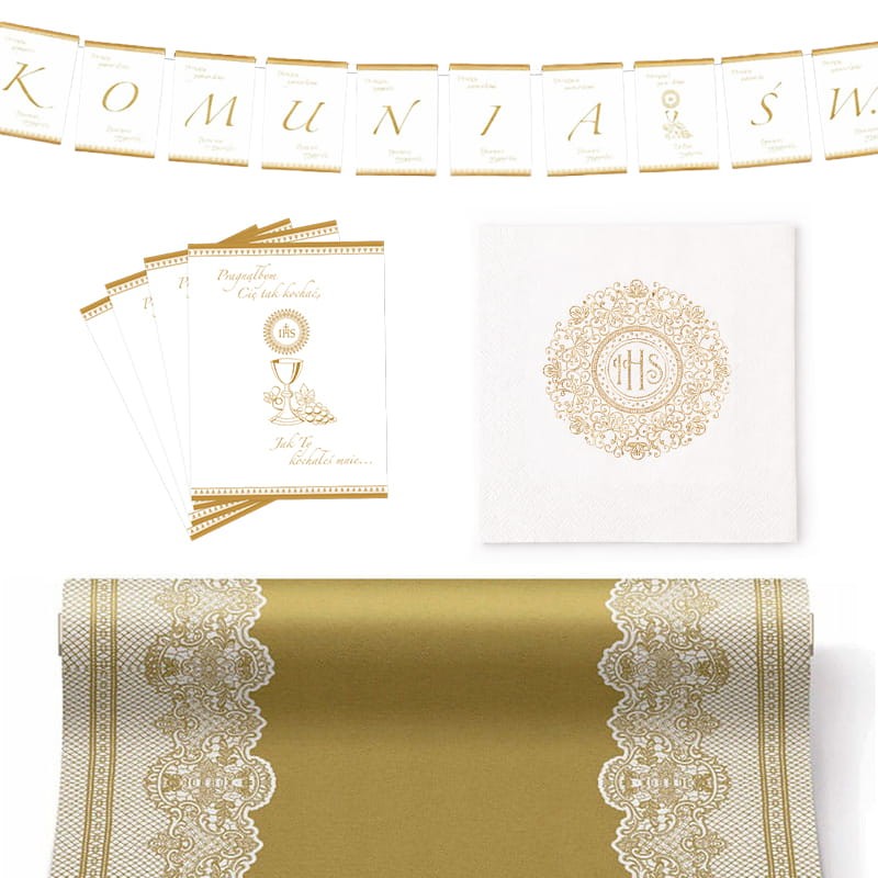 Zestaw utrzymany jest w klasycznej biało-złotej kolorystyce z bogatym motywem ornamentowej koronki oraz symbolem IHS. W jego skład wchodzi dekoracyjny bieżnik z efektownym, złotym środkiem i zdobionymi brzegami, eleganckie serwetki z subtelnym nadrukiem oraz baner z napisem „Komunia Święta”, który stanowi piękne dopełnienie całości. Złote detale nadają zestawowi luksusowego wyglądu i podkreślają uroczysty klimat wydarzenia.