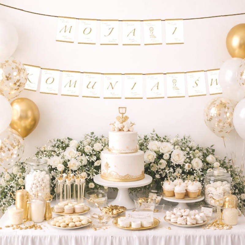 Stylowy zestaw dekoracji komunijnych w wersji złotej to doskonały wybór dla osób, które chcą nadać uroczystości wyjątkowego, eleganckiego charakteru. Idealnie sprawdzi się podczas przyjęcia z okazji Pierwszej Komunii Świętej, tworząc spójną i efektowną aranżację stołu oraz wnętrza.
