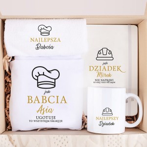 W skład zestawu wchodzi biały fartuch kuchenny dla babci z czarnym nadrukiem czapki kucharskiej oraz złotym napisem, który można spersonalizować imieniem. Do kompletu dołączono biały ręcznik kuchenny z napisem "Najlepsza Babcia", również z graficznym motywem czapki kucharskiej. Dla dziadka przygotowano notatnik w twardej oprawie z nadrukiem "Jeśli dziadek [imię] nie naprawi to nikt tego nie zrobi". Całość uzupełnia ceramiczny kubek z napisem "Najlepszy Dziadek" i ikoną narzędzi. Wszystkie produkty zostały starannie ułożone w kartonowym pudełku z białą grafiką wieńca roślinnego i napisem "Dla Ciebie", a wewnątrz wieczka umieszczono elegancką etykietę z życzeniami.