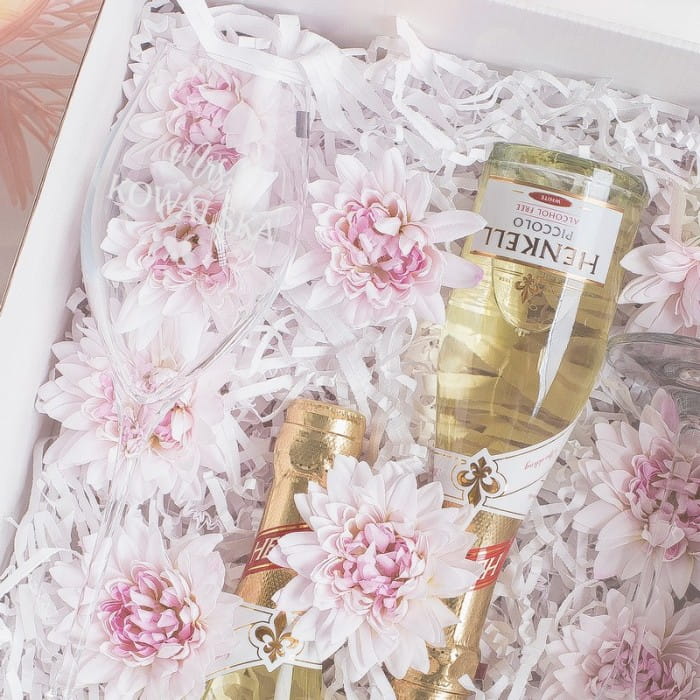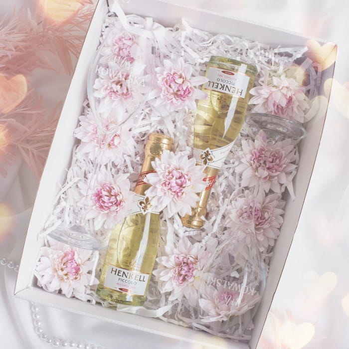 - Pomiędzy szampanami i kieliszkami znajdują się również wcześniej wspomniane dekoracyjne akcenty w formie biało-różowych kwiatów. Dzięki połączeniu upominków i ozdobników wnętrze swoim wyglądem niewątpliwie zrobi wrażenie.