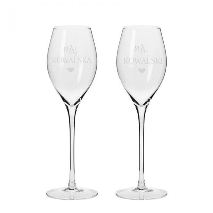 - Dno pudła wyścieła biały, karbowany wypełniacz. Na nim z kolei umieścimy elementy zestawu. Małżonkowie otrzymają w prezencie dwa mini szampany oraz dwa kieliszki. Na kieliszkach umieścimy personalizowany grawer w postaci nazwiska, w odmienionych odpowiednio formach. Personalizację poprzedzą dopiski Mrs. oraz Mr. Napisy zostaną wygrawerowane na kieliszkach, dzięki czemu nie ulegną one starciu i będą ulubionym kompletem pary przez wiele lat.