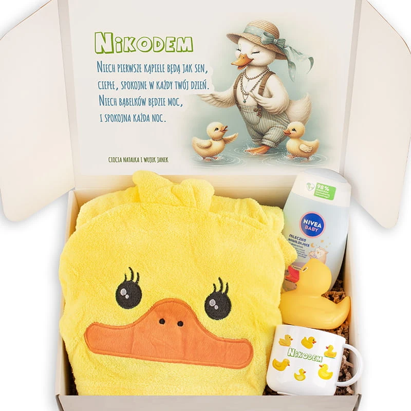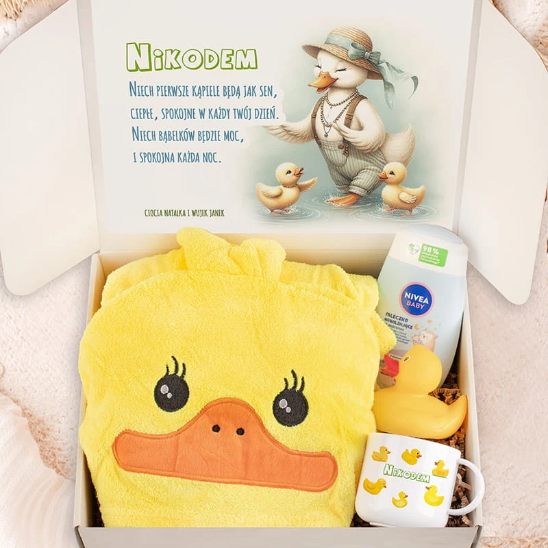 Personalizowany zestaw kąpielowy z uroczą kaczuszką to wyjątkowy pomysł na prezent dla maluszka. To propozycja dla osób szukających praktycznego, a jednocześnie oryginalnego upominku na narodziny dziecka, urodziny czy Dzień Dziecka. Motyw kaczuszki wprowadza ciepły, dziecięcy klimat.