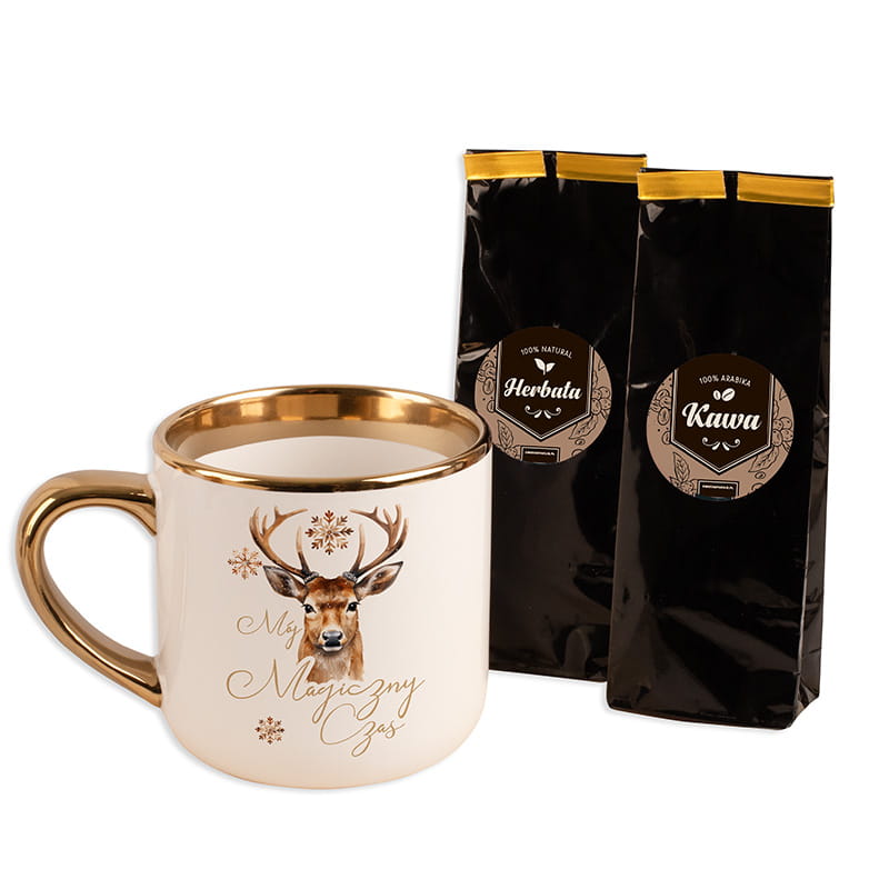 Na pierwszy plan wysuwa się porcelanowy kubek z grafiką jelenia, napisem „Mój Magiczny Czas” i złotymi zdobieniami – w tym połyskującym uchwytem i wykończeniem rantów. Obok niego znajdują się dwa elegancko zapakowane produkty: 100% naturalna herbata oraz 100% Arabika. Torebki są utrzymane w ciemnej, minimalistycznej stylistyce z okrągłą etykietą. Całość prezentuje się spójnie, gustownie i bardzo świątecznie – idealna kompozycja dla osób ceniących jakość i detal.