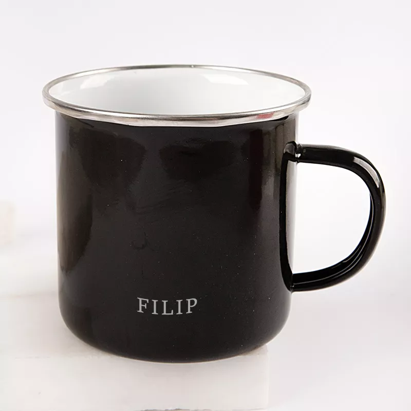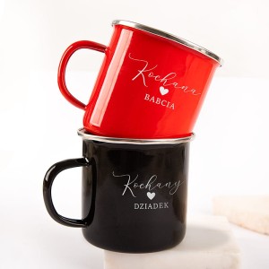 Zestaw składa się z dwóch emaliowanych kubków – czerwonego dla babci oraz czarnego dla dziadka. Każdy z nich wykonany jest z metalu. Zewnętrzna część kubka posiada elegancki nadruk ‘Kochana Babaci” i „Kochany Dziadek” ozdobną czcionką, natomiast środek pozostaje jasny i kontrastujący. Z tyłu każdego kubka możliwe jest umieszczenie imienia, dzięki czemu każdy z elementów zestawu staje się unikalny. Metalowa obręcz oraz wygodne ucho zapewniają komfort użytkowania.