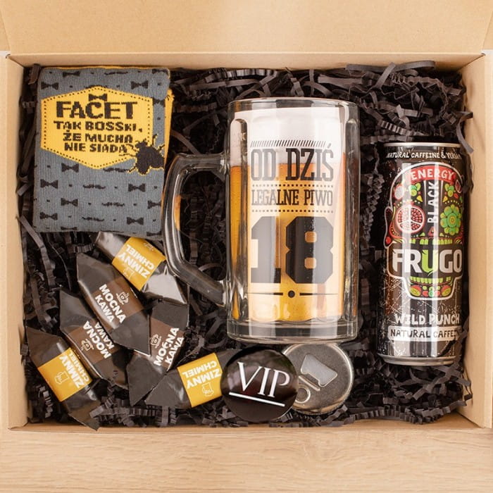 Gotowy prezent dla chłopaka na 18 urodziny. W pudełku znajdują się: