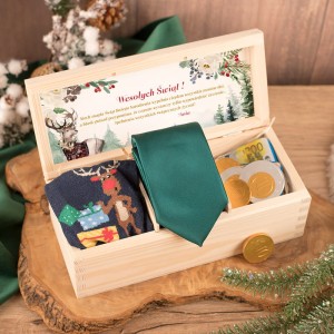 Skrzynka wykonana jest z jasnego, surowego drewna, co nadaje jej naturalnego i uniwersalnego wyglądu. W środku umieszczono trzy elementy: klasyczny krawat w satynowym wykończeniu (kolor dobierany losowo), świąteczne skarpetki oraz czekoladowe monety imitujące euro. Na wewnętrznej stronie wieczka znajduje się kartka z życzeniami w świątecznym stylu – ozdobiona grafiką oraz podpisem, który można dowolnie spersonalizować. Dzięki temu całość wygląda jak gotowy prezent prosto spod choinki. Detale wykonania i kompozycja wnętrza zostały zaprojektowane tak, aby zestaw prezentował się estetycznie już po otwarciu, bez konieczności dodatkowego pakowania.
