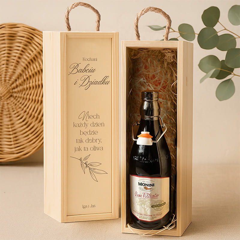 Zestaw składa się z ciemnej butelki oliwy Monini Non Filtrato (750 ml) zamkniętej w solidnej, jasnej drewnianej skrzynce z rączką ze sznurka. Naturalne wypełnienie z sianka chroni zawartość i podkreśla ekologiczny charakter prezentu. Przednia ścianka skrzynki posiada estetyczny grawer z napisem dla babci i dziadka, który może przybrać jedną z trzech wersji: „Kochani Babciu i Dziadku”, „Kochana Babciu” lub „Kochany Dziadku”. Niżej umieszczone są życzenia oraz personalizowany podpis – np. imiona wnuków. Całość tworzy harmonijny zestaw gotowy do wręczenia bez konieczności dodatkowego pakowania.