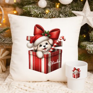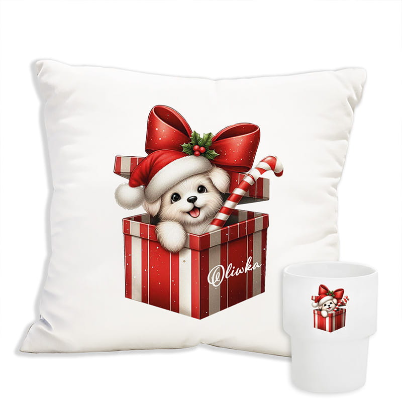 Poduszka wykonana jest z miękkiego materiału z nadrukiem przedstawiającym białego pieska w czapce świętego Mikołaja, siedzącego w czerwono-białym pudełku ozdobionym wielką kokardą. Całość uzupełnia świąteczna laska cukrowa oraz możliwość dodania imienia, co nadaje całości indywidualnego stylu. Kubek ceramiczny zawiera ten sam motyw – nadruk jest wyraźny, trwały i odporny na zmywanie. Wzór utrzymany w czerwonej i białej kolorystyce dobrze komponuje się z innymi dekoracjami bożonarodzeniowymi.