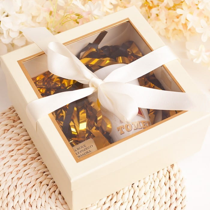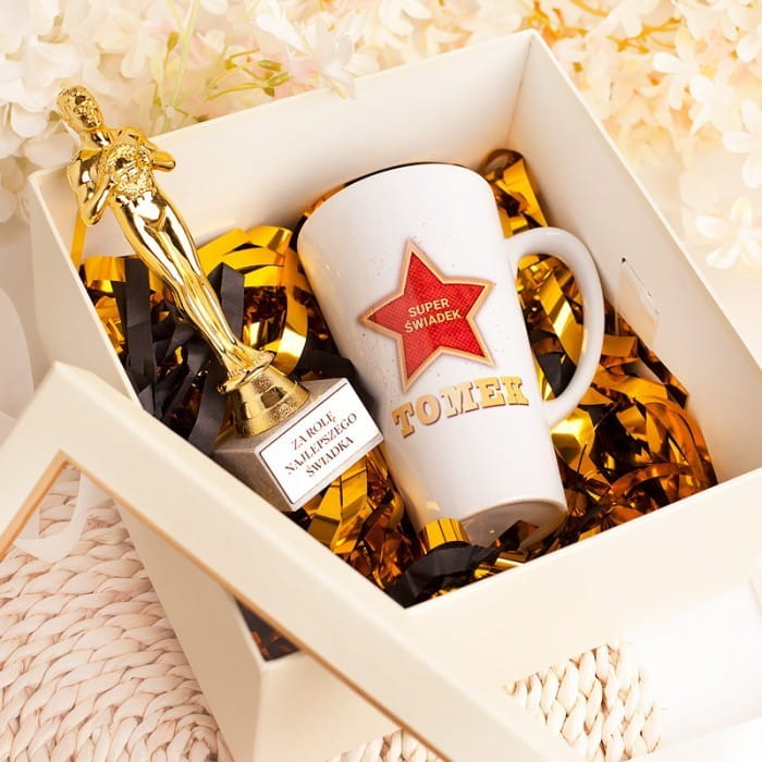 - Zestaw Prezent dla Świadka Kubek i Statuetka w pudełku to idealne podziękowanie. Dla świadka drugoplanowa rola w uroczystości jest niezwykłym wyróżnieniem. Cieszy się, że może poświadczyć o Waszej miłości i potwierdzić złożone przysięgi. Jest mistrzem ceremonii i drugiego planu. Stara się, by Wasz dzień był wyjątkowy. Dlatego zasługuje na statuetkę „Za rolę najlepszego świadka” przypominającą Oskara. Obok niej w pudełku wypełnionym złoto-czarnymi wstążkami znajdzie się kubek. Na nim nadrukujemy laserowo czerwoną gwiazdę z napisem Super Świadek oraz imię najważniejszej „prawej ręki” w czasie ślubu. Kubek jest dość smukły, wysoki i poszerza się ku górze. Idealnie sprawdzi się na aromatyczną kawę z podwójnym mlekiem. Całość zamknięta jest w białym pudełku, przewiązanym wstążką. Przezroczysta część wieczka jest podkreślona złotą ramką. Taki prezent wpisuje się w wesele w stylu glamour.