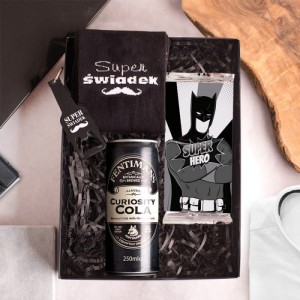 - W czarnym pudełku umieściliśmy lizak z wizerunkiem super bohatera. Obok niego znajduje się puszka z colą o cytrusowym aromacie. Wewnątrz jest jeszcze brelok z personalizacją, czyli napisem: „Super Świadek”, a także grafiką wąsów. Ten sam napis i grafika widnieją na czarnych skarpetkach dołączonych do zestawu. Pudełko ma eleganckie, czarne wypełnienie, na którym położone są wszystkie elementy. Dodatkowo wyposażone jest w transparentne wieko. Zatem świadek od razu może zobaczyć, co dostał.