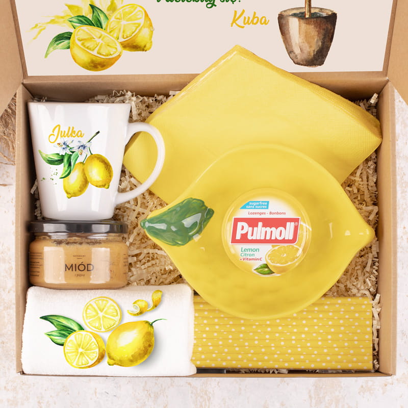 W zestawie znajduje się stylowy kubek o pojemności 300 ml, ozdobiony nadrukiem cytryn i personalizowanym imieniem osoby obdarowanej. Towarzyszy mu słoiczek pysznego miodu, który idealnie komponuje się z herbatą lub porannym rytuałem odpoczynku. Całość uzupełniają cukierki Pulmoll o cytrynowym smaku – idealne, by dodać energii w ciągu dnia. Nie zabrakło też praktycznych dodatków w słonecznym stylu – ręczniczka z cytrynowym nadrukiem oraz miseczki w kształcie cytryny, która sprawdzi się zarówno w kuchni, jak i na biurku jako pojemniczek na drobiazgi. Uroku dopełniają żółte serwetki i słomki, które idealnie podkreślają temat przewodni i dodają całości świeżego charakteru.