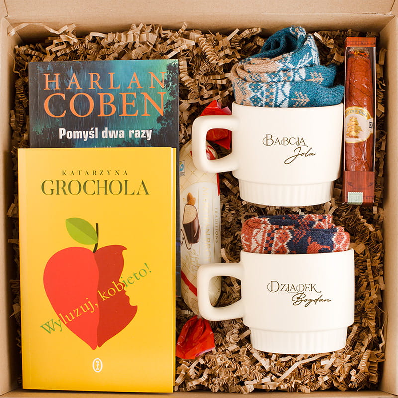 Jeśli chcesz wręczyć wspólny prezent dla dziadków to wybierz ten zestaw prezentowy! Box zachęca do wspólnego relaksu: babcia z kubkiem i książką, dziadek z kubkiem i kryminałem, a do tego słodkości i ciepłe skarpety do domowego odpoczynku. Brzmi jak plan na idealne popołudnie, prawda? Na jakie okazje sprawdzi się najlepiej gotowy zestaw? Idealnie pasuje na Dzień Babci i Dziadka, rocznice, święta, podziękowanie, a nawet bez okazji!