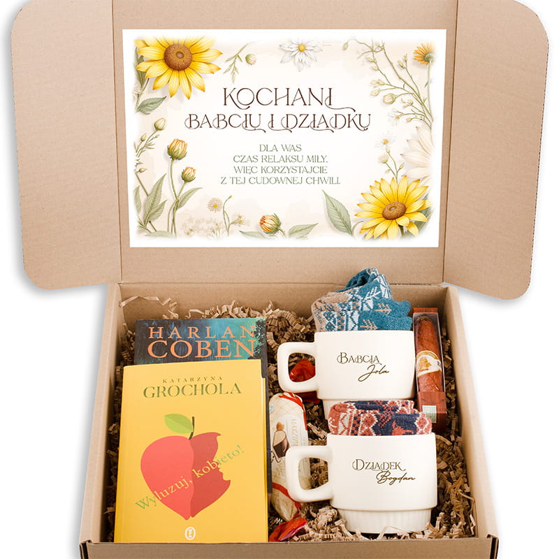 Szukasz czegoś, co wywoła uśmiech, wzruszenie i sprawi, że dziadkowie poczują się naprawdę docenieni? Ten zestaw prezentowy dla dziadków to gotowy pomysł na wyjątkowy upominek dla babci i dziadka. Eleganckie kubki, skarpety, książki i słodkości zamknięte w ozdobnym pudełku tworzą zestaw, który można wręczyć od razu - bez kompletowania na ostatnią chwilę.