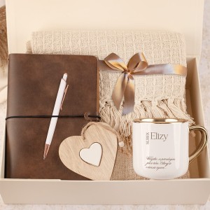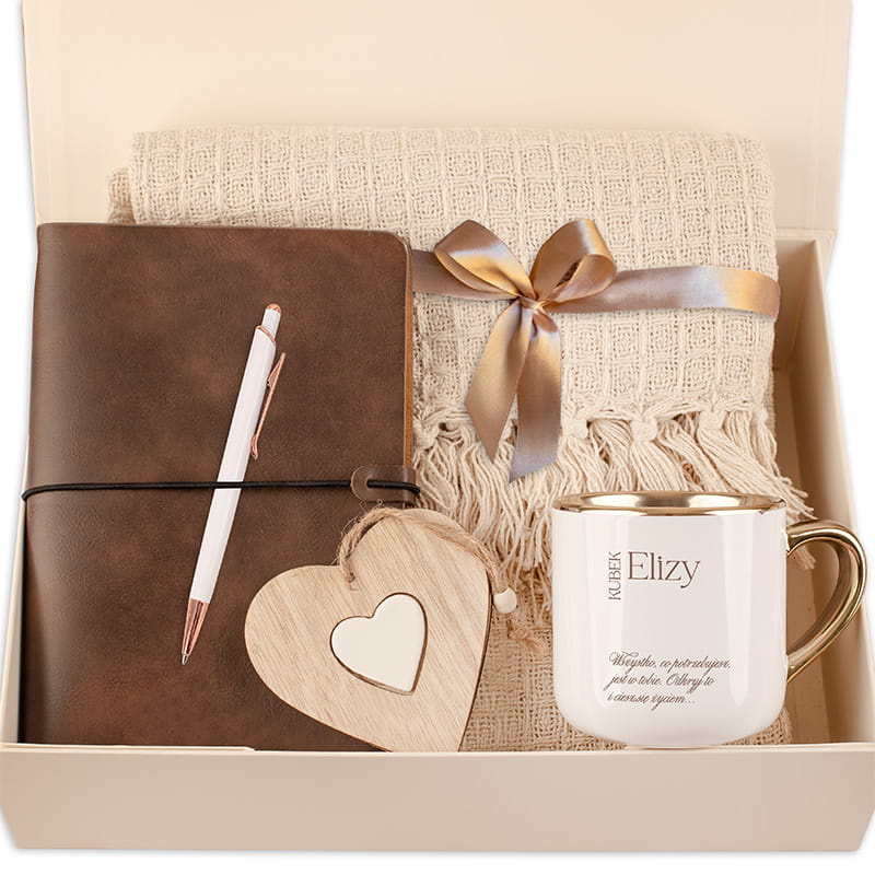 W środku znajduje się miękki, kremowy koc wykończony frędzlami. Jego neutralna barwa sprawia, że łatwo wpasowuje się w różne wnętrza i dodaje im przytulnego klimatu. Obok koca ułożono kubek z nadrukowanym imieniem oraz motywującą sentencją: „Wszystko, co potrzebujesz, jest w Tobie. Odkryj to i ciesz się życiem…”. Personalizacja sprawia, że prezent nabiera indywidualnego charakteru i staje się czymś więcej niż zwykłym upominkiem. Zestaw uzupełnia notes w brązowej oprawie oraz pasujący długopis. To praktyczne akcesoria, które ułatwiają organizację codziennych obowiązków, a jednocześnie mogą służyć do zapisywania inspiracji czy ważnych refleksji. W środku znalazła się także drewniana zawieszka w kształcie serca – drobny akcent dekoracyjny, który dodaje całości naturalnego uroku i symbolicznego znaczenia.