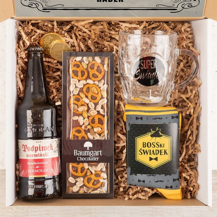 W skład tego zestawu wchodzi duża, ręcznie robiona czekolada z precelkami, która dosłownie rozpływa się w ustach, pozostawiając uczucie niebiańskiego smaku. Aby uczcić tę chwilę, mamy także podpiwek bezalkoholowy, gotowy do podniesienia toastu na te szczególne momenty. Kufel z napisem "Super Świadek" to nie tylko pojemnik na napoje, to symboliczny znak przyjaźni i wsparcia, który zostanie na zawsze. Dodatkowo, zestaw zawiera zabawne skarpety, które dostarczą uśmiechu i pozytywnej energii. I na koniec, dwie czekoladowe monety, pyszne słodkości dla każdego. Aby sprawić, że to pytanie o świadkowanie będzie jeszcze bardziej osobiste, do zestawu dołączona jest personalizowana wklejka do pudełka. Na niej znajduje się imię i nazwisko świadka oraz podpis Pana Młodego, co nadaje temu prezentowi niezapomniany charakter i sprawia, że staje się on trwałą pamiątką.