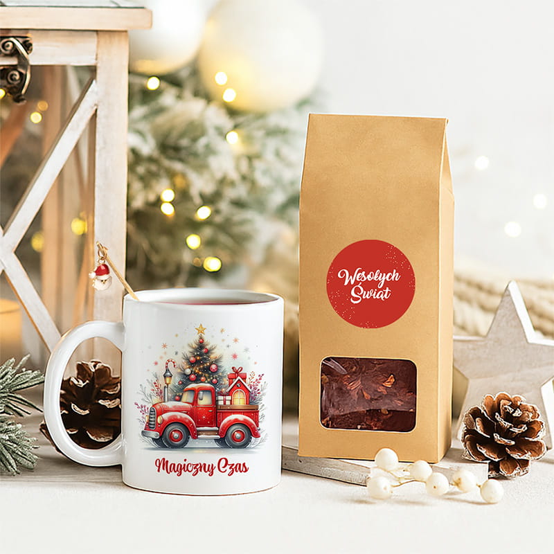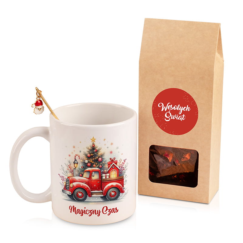 W skład zestawu wchodzi ceramiczny kubek z nadrukiem czerwonej ciężarówki i napisem "Magiczny Czas". Obok znajduje się torebka aromatycznej herbaty zapakowana w kraftowe opakowanie z naklejką „Wesołych Świąt”. Całości dopełnia metalowa łyżeczka w złotym kolorze z świąteczną ozdobą na końcu uchwytu. Dobór kolorów — biel, czerwień, złoto i naturalny brąz — tworzy spójną i przyciągającą wzrok kompozycję, która będzie świetnie prezentować się pod choinką lub na biurku w pracy.