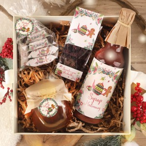 W skład zestawu wchodzi suszona herbata świąteczna, zapakowana w przezroczystą torebkę z ozdobną etykietą. Towarzyszy jej butelka malinowego syropu z etykietą w świątecznym stylu, idealnego do rozgrzewających napojów lub deserów. Zestaw zawiera także klasyczny słoiczek miodu oraz porcję krówek, zawiniętych w papierki ze świątecznymi motywami. Wszystko ułożone jest w wiórkowym wypełnieniu i zamknięte w estetycznym, gotowym do wręczenia kartonowym pudełku. Całość prezentuje się lekko, świątecznie i przytulnie – jak domowe popołudnie w grudniu.