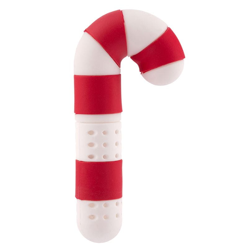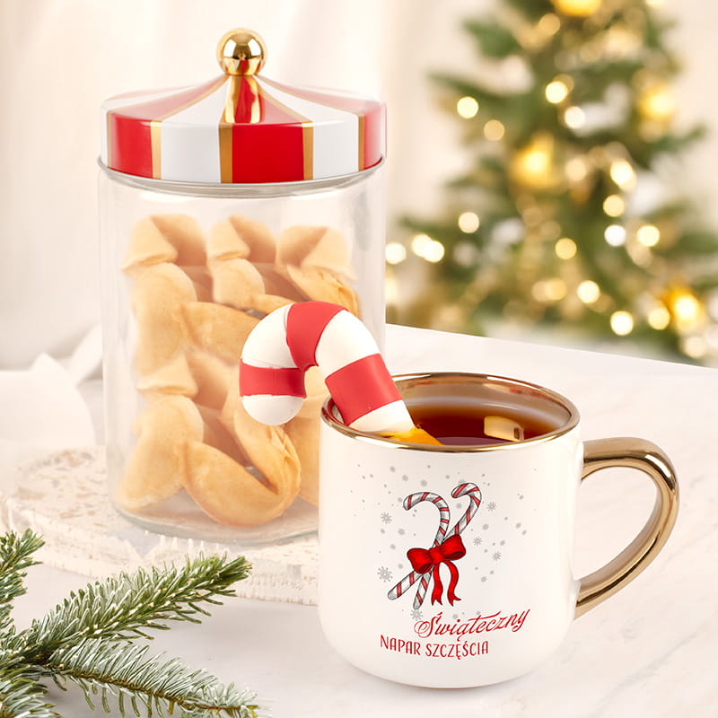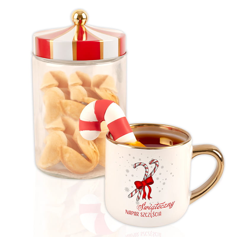 Zestaw składa się z trzech elementów. Pierwszy to ceramiczny kubek z nadrukiem „Świąteczny napar szczęścia”, ozdobiony grafiką w stylu retro z dwiema skrzyżowanymi laskami cukrowymi przewiązanymi czerwoną kokardą. Ranty i ucho kubka wykończone jest połyskującym złotem. Do zestawu dołączono również oryginalny zaparzacz w formie czerwono-białej laski cukrowej, idealny do parzenia ulubionej herbaty lub ziół. Całość dopełnia duży szklany słoik z wieczkiem w pasy, wypełniony ciasteczkami z wróżbą. Wszystko utrzymane jest w ciepłej, świątecznej kolorystyce – złoto, biel, czerwień – co czyni ten zestaw pięknym również wizualnie.
