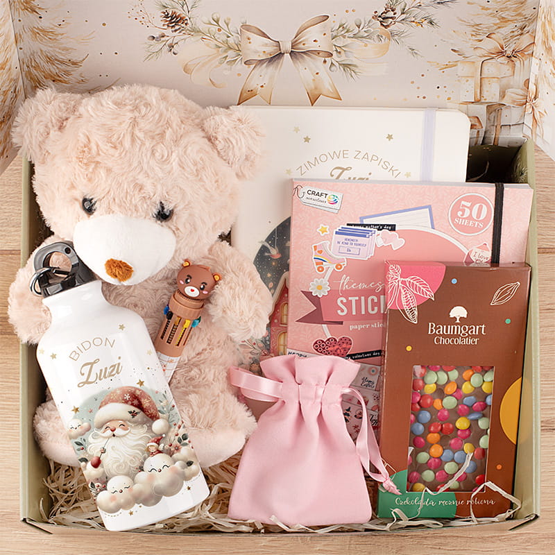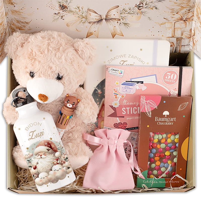 W skład zestawu wchodzi miękki pluszowy miś oraz bidon z grafiką św. Mikołaja i imieniem. Obok znajduje się notes z zimową ilustracją i imieniem dziecka, idealny do zapisków, rysunków lub prac kreatywnych. W zestawie znalazła się również książeczka z naklejkami, czekolada z kolorowymi drażetkami w eleganckim kartoniku, długopis z ozdobnym motywem misia oraz różowy woreczek materiałowy, do którego można schować drobne skarby. Całość zapakowana jest w pudełko prezentowe z zimowym nadrukiem, dzięki czemu nie wymaga dodatkowego opakowania.