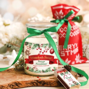 Świeca została zamknięta w solidnym, szklanym słoju z przezroczystym wieczkiem i przewiązana zieloną, satynową wstążką. Etykieta zdobiąca świecę utrzymana jest w świątecznej kolorystyce z motywami gałązek, jarzębiny, śnieżynek i bombek. Centralne miejsce zajmuje napis „Wesołych Świąt Bożego Narodzenia” oraz możliwość personalizacji – można dodać imiona osób wręczających prezent. Do kompletu dołączone jest pudełko zapałek z pasującą grafiką oraz podpisem „Rozpal Magię Świąt”. Wszystko zapakowane jest w tekstylny worek z nadrukiem „Merry Christmas”.