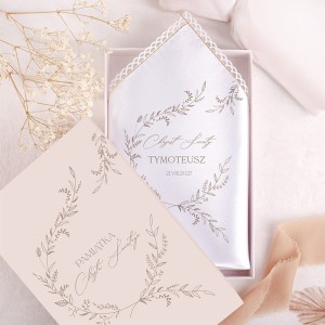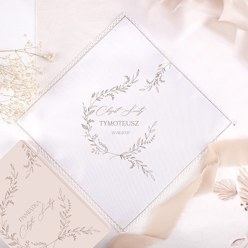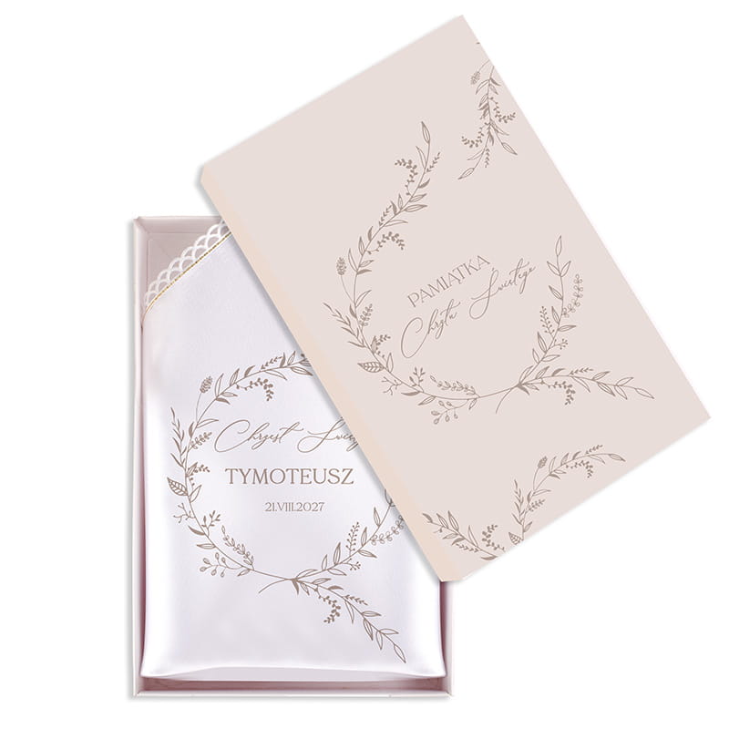 Zestaw zawiera starannie uszytą, białą szatkę z koronką obszytą złotą lamówką. Na szatce znajduje się nadruk "Chrzest święty" a pod nim umieszczone jest imię dziecka oraz data chrztu świętego. Wzór wokół napisu składa się z florystycznego motywu w odcieniach beżu i złota. Całość umieszczona jest w dopasowanym kolorystycznie pudełku prezentowym z napisem „Pamiątka Chrztu Świętego”, które chroni zawartość i sprawia, że produkt jest gotowy do wręczenia jako prezent.