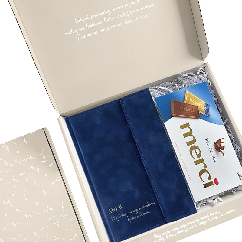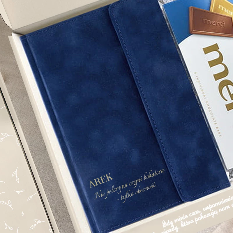 W skład zestawu wchodzi notes welurowy z możliwością personalizacji oraz czekolada Merci. Notes posiada miękką, przyjemną w dotyku okładkę. Dostępny jest w dwóch kolorach do wyboru: bordowym i granatowym. Na okładce umieścimy imię oraz tekst: "Nie peleryna czyni bohatera - tylko obecność". Całość zapakowana jest w estetyczne pudełko z wypełnieniem, dzięki czemu zestaw prezentuje się elegancko i nie wymaga dodatkowego pakowania. To praktyczne rozwiązanie dla osób, które szukają gotowego prezentu o wysokim standardzie wykonania.