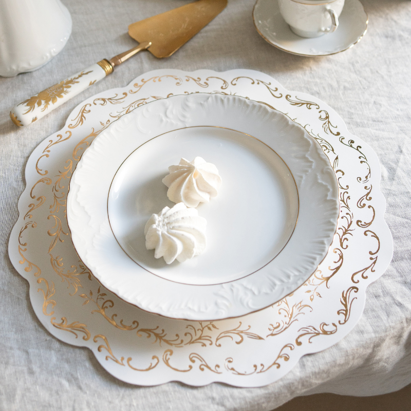 W zestawie znajduje się 6 sztuk jednostronnych podkładek, które świetnie sprawdzają się jako baza pod talerze lub elementy dekoracyjne, np. pod świeczniki, wazony czy paterę z tortem. Dzięki neutralnej bieli i eleganckiemu złotu, z łatwością wkomponują się w niemal każdą oprawę stołu, zarówno w stylu glamour, jak i klasycznym, rustykalnym czy romantycznym. Podkładki te to nie tylko ozdoba, ale również praktyczne rozwiązanie, które chroni powierzchnię stołu i ułatwia utrzymanie czystości. Są jednorazowe, co czyni je idealnym wyborem na większe przyjęcia.