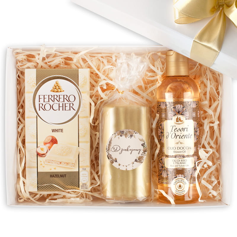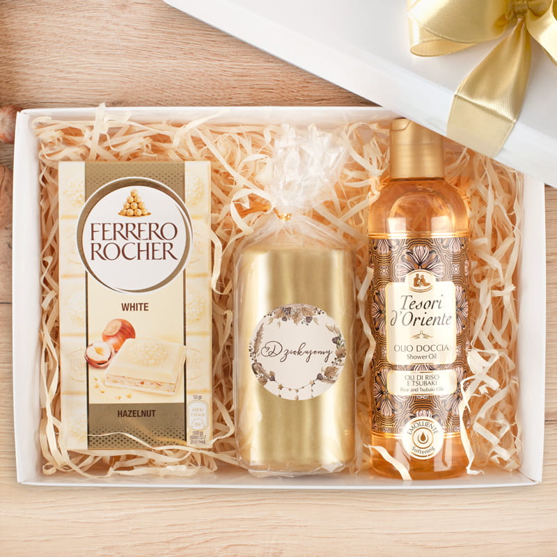 W środku czekają na nią elementy, które łączą smak, zapach i pielęgnację w harmonijną całość. Każdy z nich został dobrany tak, by tworzyć wyjątkowy rytuał relaksu, który obdarowana osoba zapamięta na długo. Delikatne aromaty, luksusowe wykończenia i estetyka godna najpiękniejszych okazji – to wszystko sprawia, że Złoty BOX prezentowy nie jest zwykłym podarunkiem, lecz przemyślaną formą podziękowania. Zestaw zawiera elegancką świecę zapachową, która roztacza ciepły, relaksujący aromat i wprowadza wyjątkowy nastrój. Dopełnieniem całości jest biała czekolada Ferrero Rocher, której kremowa konsystencja i chrupiące orzechy sprawiają, że każda kostka to czysta przyjemność. Z kolei aromatyczny olejek pod prysznic Tesori d’Oriente pielęgnuje skórę, pozostawiając ją miękką i otuloną orientalnym zapachem na długo.