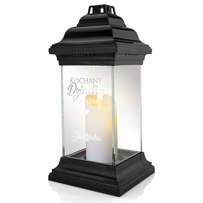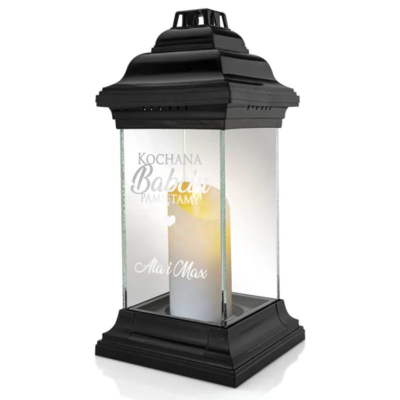 Znicz ma elegancki, klasyczny wygląd – czarna obudowa połączona z przezroczystymi ściankami sprawia, że całość prezentuje się estetycznie i bardzo schludnie. Do wyboru dostępny jest wariant dla babci lub dla dziadka, z dedykowanym tekstem oraz podpisem od bliskich. Dzięki temu znicz zyskuje unikalny charakter i staje się osobistym wyrazem pamięci – takim, który mówi więcej niż standardowy produkt.